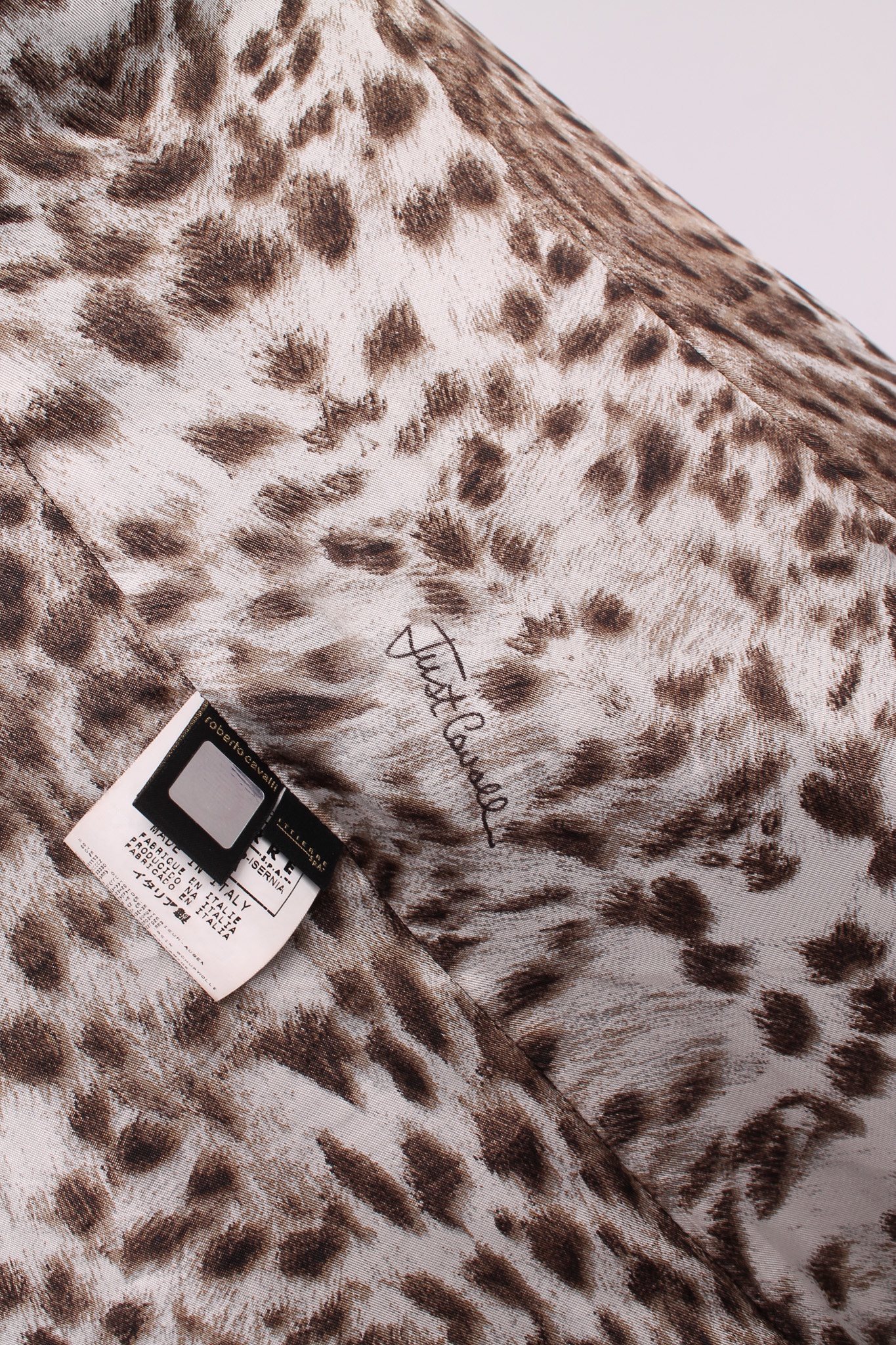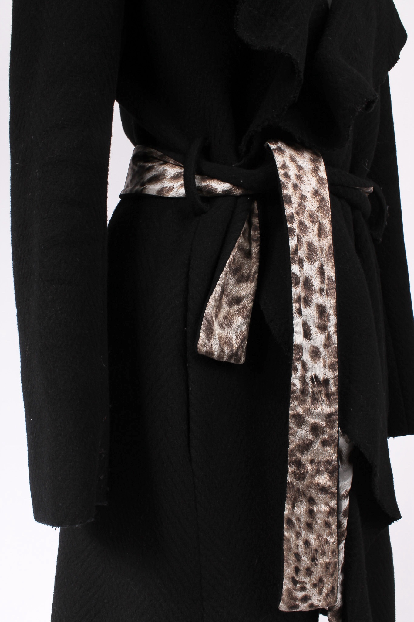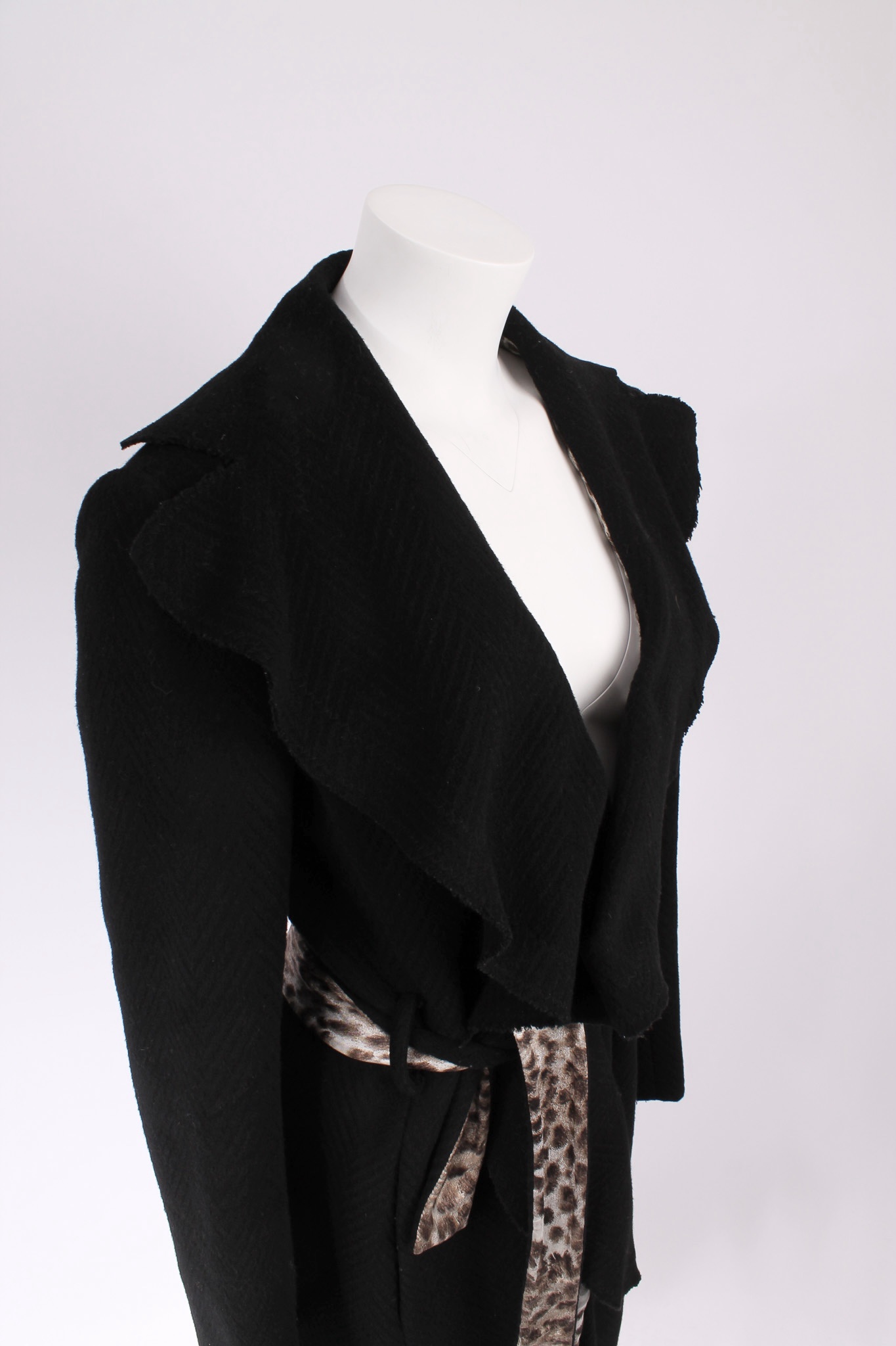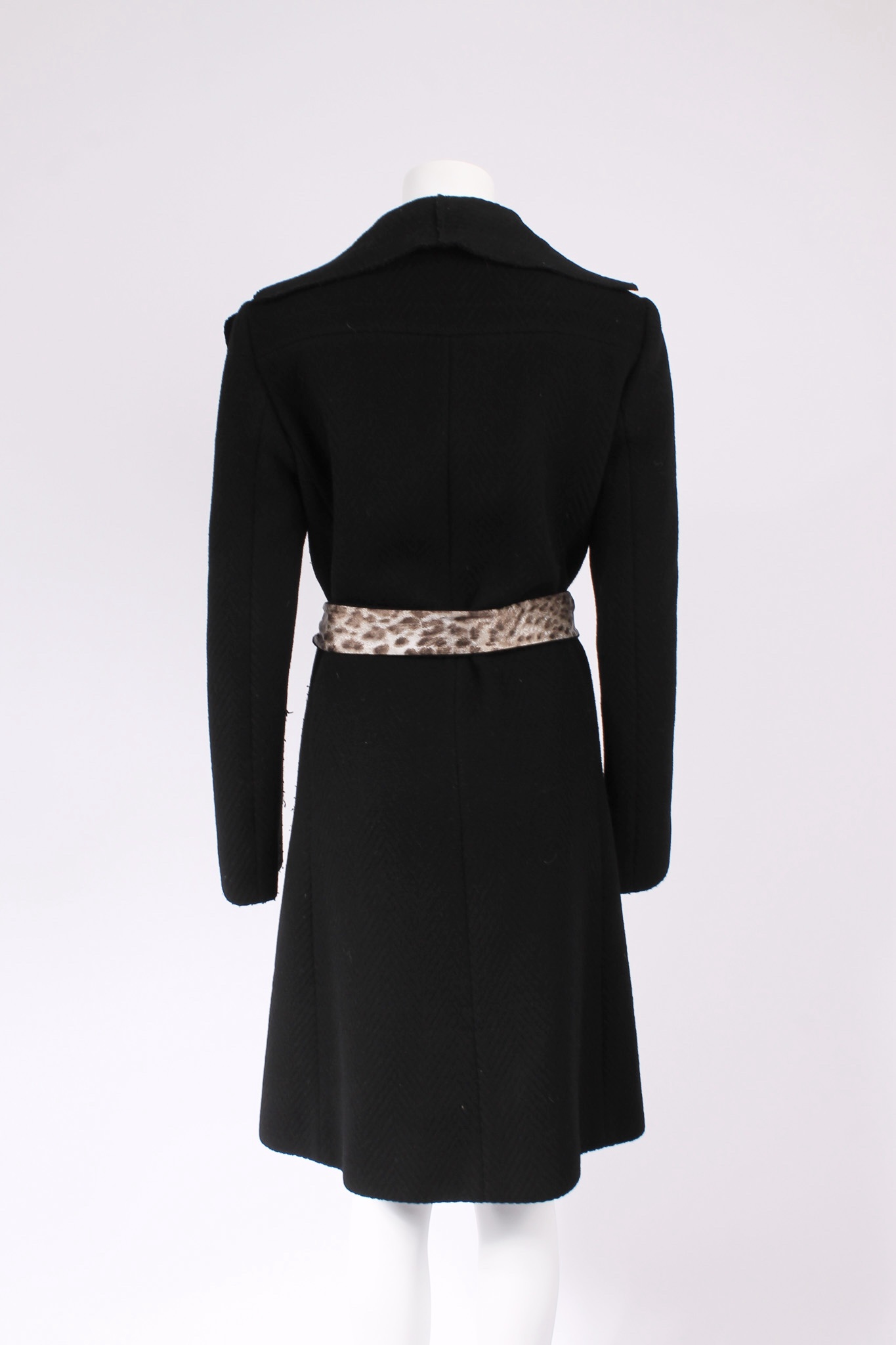 Cappotto Just Cavalli nero con cintura coordinata e dettaglio leopardato su un lato, in armonia con la fodera interna animalier. Doppia tasca laterale e chiusura con bottone frontale.