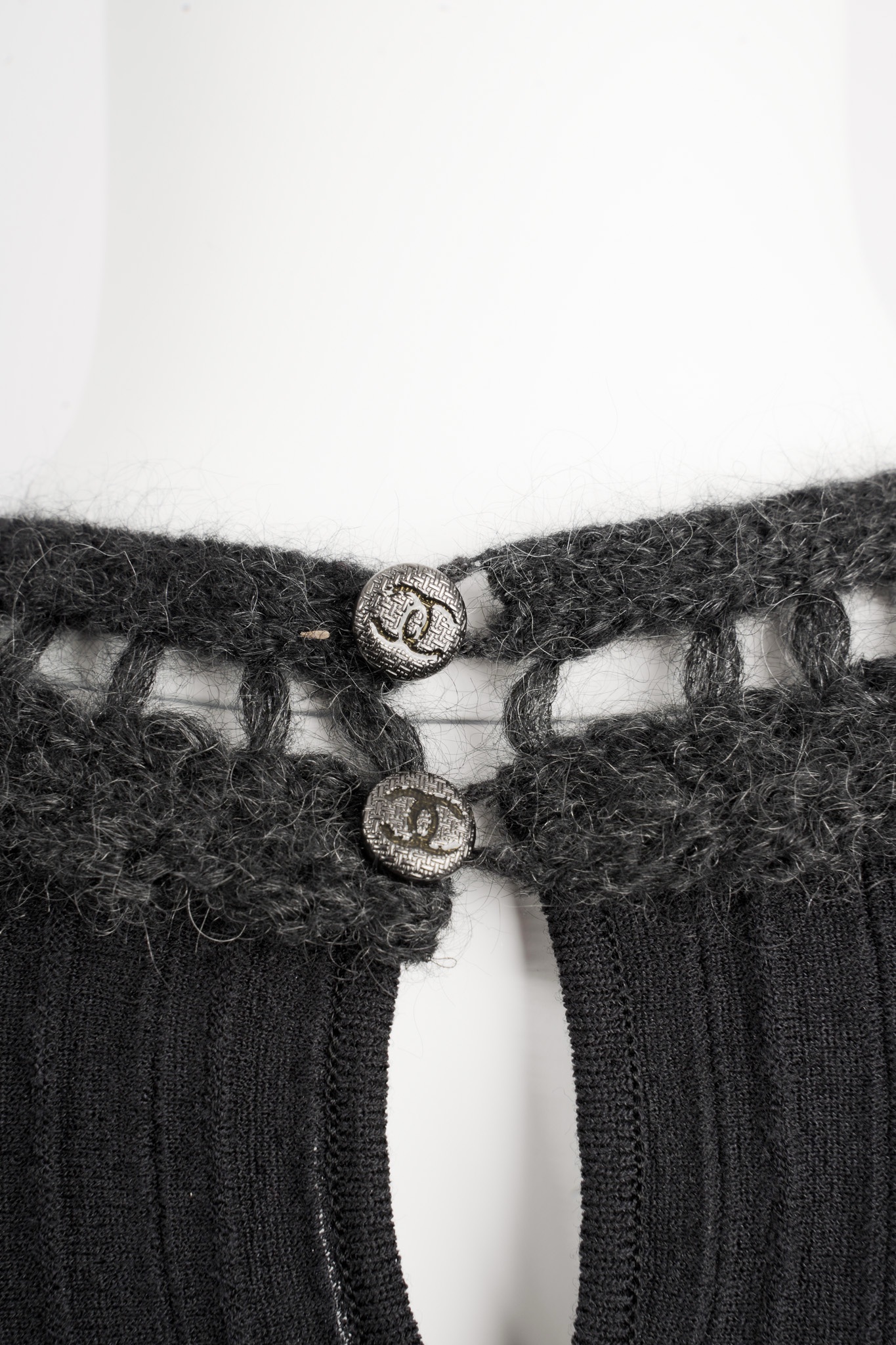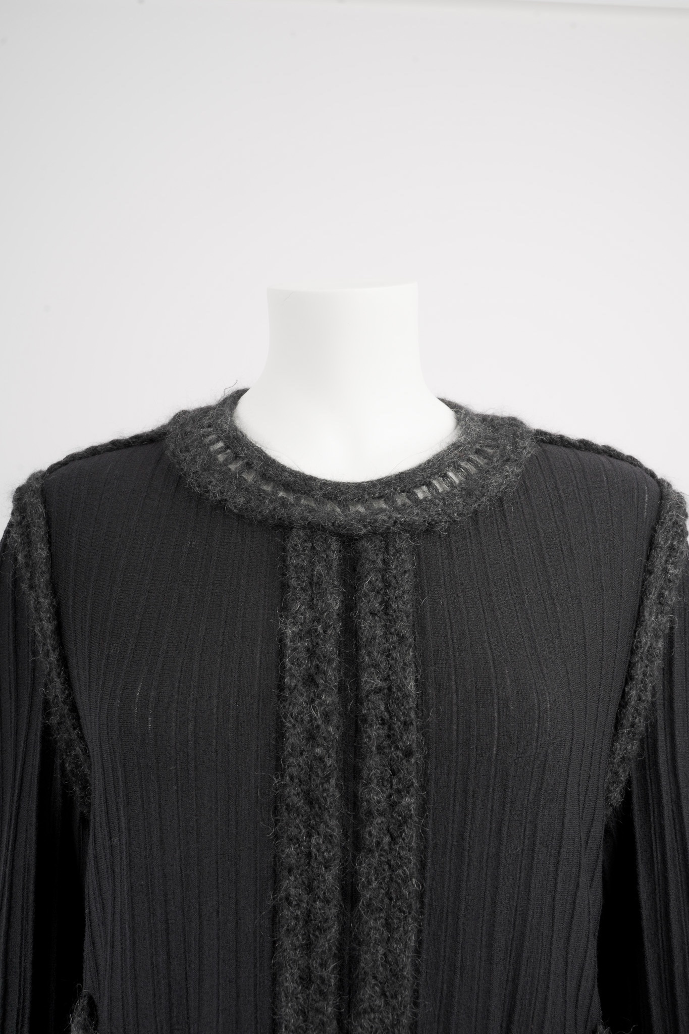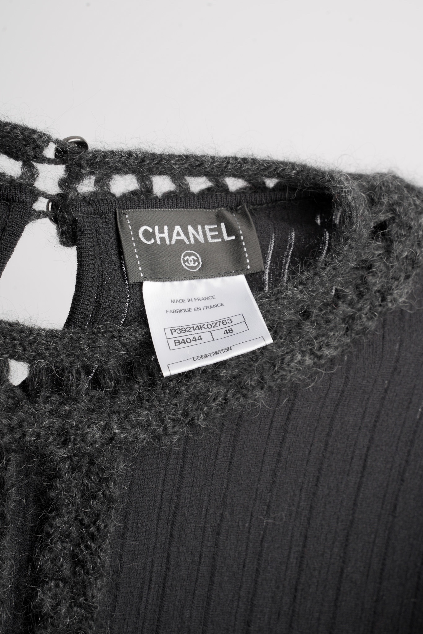 Abito Chanel vintage (anno 2010) in pregiato mix con mohair, dalla linea elegante e strutturata. Chiusura posteriore con due bottoni logati. Tessuto caldo e di qualità, ideale per look serali o occasioni formali.